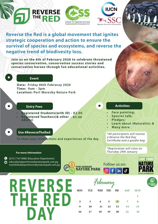 Join us on Reverse the Red Day 2026 at Port Moresby Nature Park to celebrate threatened species conservation, conservation success stories, and the heroes working to protect nature — all through fun and educational activities for students, educators, and the wider community.